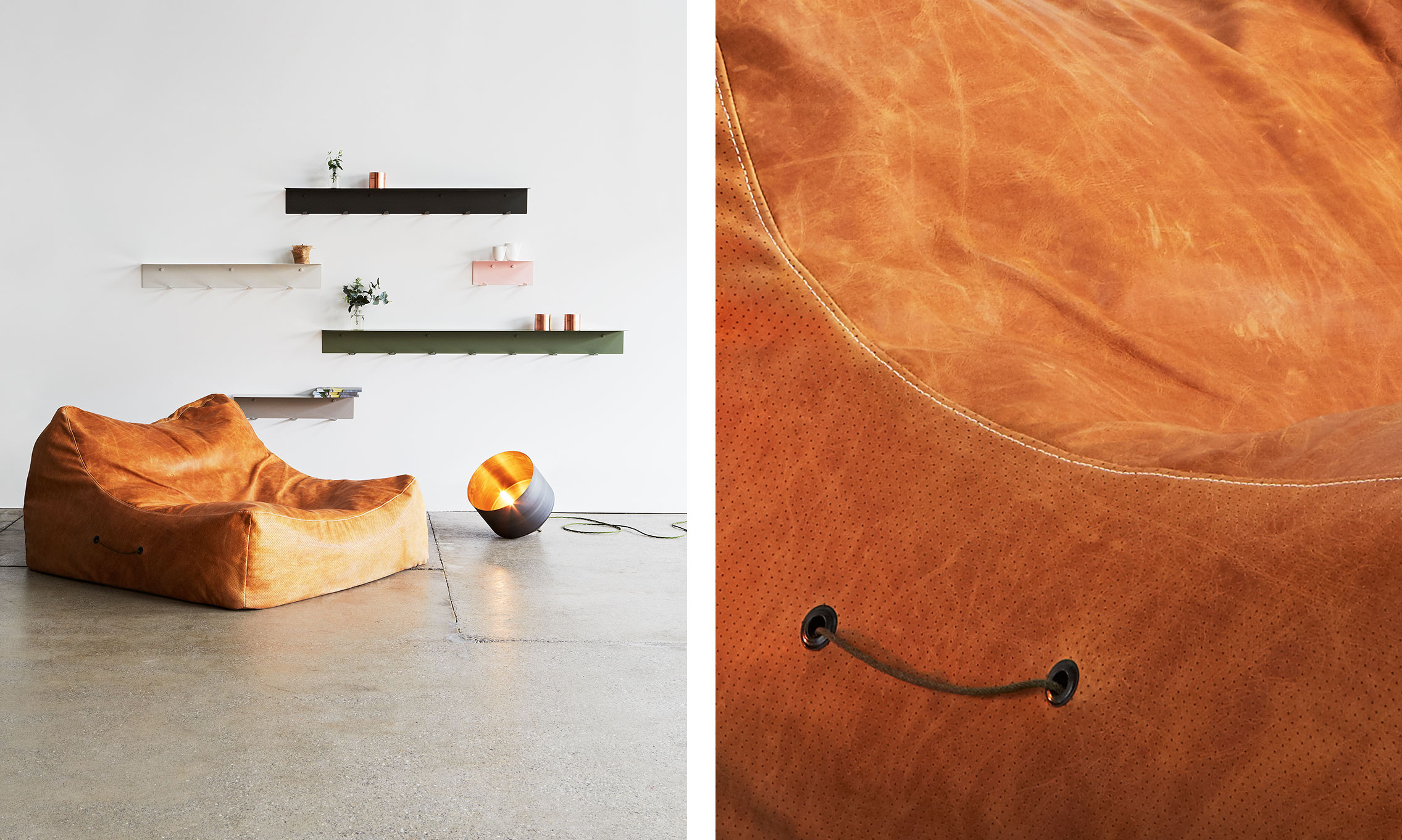 The Rouseabout emerged as a bi-product of the design process for The Shearer. It explores simple ad hoc seating such as half-filled wool bales, grain bags, and wool itself. Combining premium grade custom tanned leather with conscious use of recycled polystyrene beads the Rouseabout ensures ultimate comfort for tired legs.