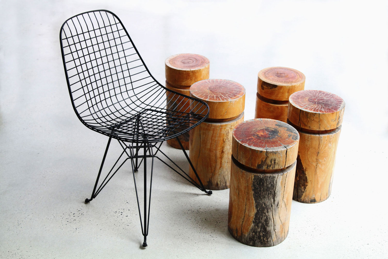 Simple reuse of fallen branches and trees, the diameter of the is guided by the diameter of the logs available, diameters range from 230mm to 300mm diameter, height of the stools is limited to 450mm. All log selection, design and machining overseen by LifeSpaceJourney.